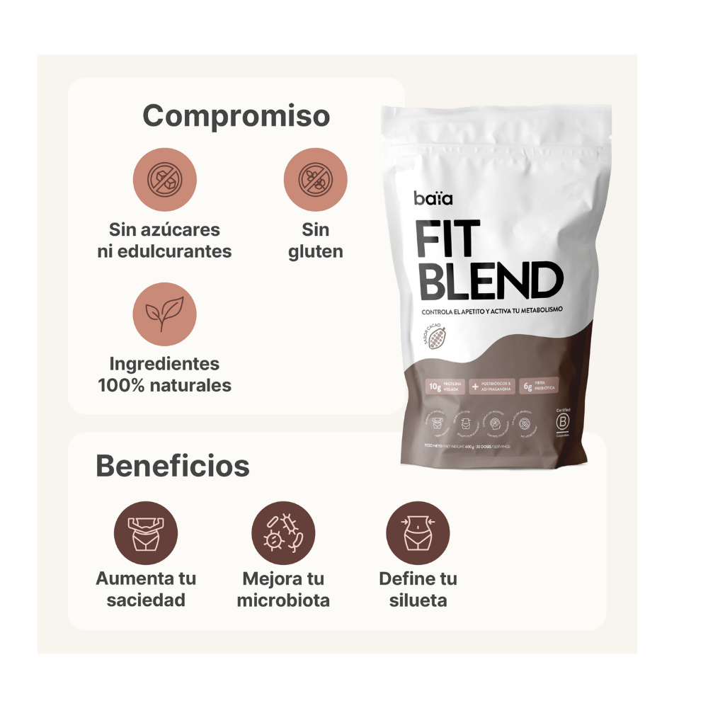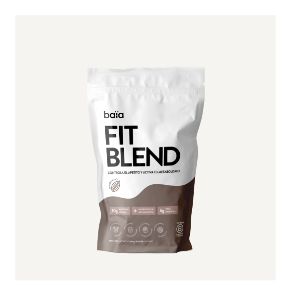 BAIA Fit Blend Chocolate de Baïa Food es un complemento nutricional diseñado para apoyar la saciedad, el equilibrio metabólico y el control del apetito, con un sabor agradable a chocolate que facilita su incorporación en el día a día. Su fórmula combina ingredientes seleccionados que ayudan a regular el hambre, mejorar la adherencia a la alimentación y favorecer hábitos más equilibrados.