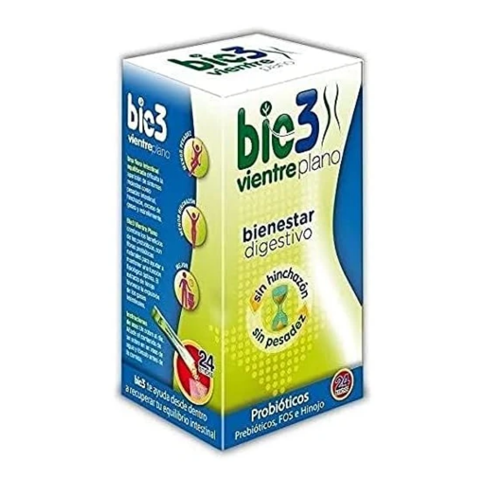 BIE3 Vientre Plano es un complemento alimenticio en sticks solubles formulado para ayudar a reducir la hinchazón abdominal, favorecer la digestión y contribuir a un abdomen más plano. Su fórmula combina ingredientes naturales que apoyan el equilibrio intestinal y el bienestar digestivo, ideal para personas que sufren sensación de pesadez o gases.
