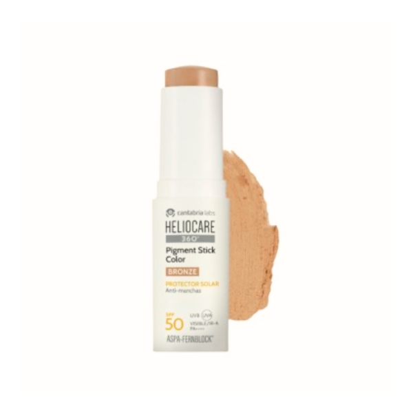 Heliocare 360º Pigment Solution Stick SPF50+ tono Bronze es un fotoprotector facial en formato stick diseñado para proteger la piel frente al sol y prevenir la aparición de manchas, al mismo tiempo que aporta un toque de color natural que ayuda a unificar el tono de la piel.