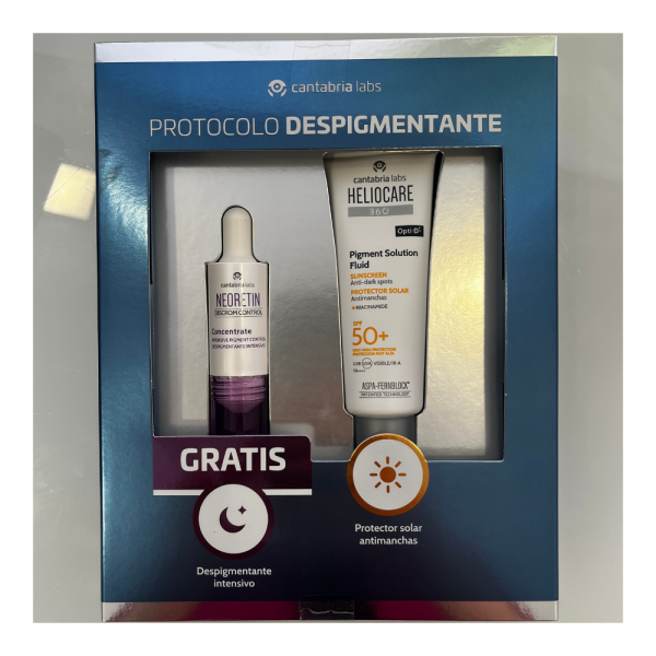 Pack combinado para protección y corrección de la hiperpigmentación, que une la defensa solar avanzada del fotoprotector Heliocare Pigment con la acción despigmentante y regeneradora del sérum Neoretin Discrom Concentrate. Ideal para pieles con manchas, tono irregular o exposición frecuente al sol, ofreciendo una rutina completa de cuidado diario.