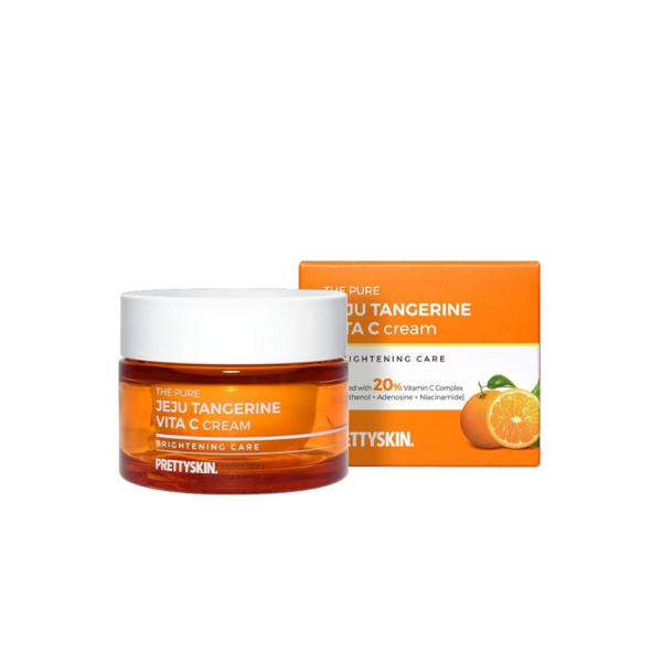 Jeju Tangerine Vita C Cream de Prettyskin es una crema facial iluminadora que combina la vitamina C natural procedente de la tangerina de la isla de Jeju con activos hidratantes y antioxidantes para revitalizar la piel desde el primer uso. Su textura ligera y fresca se absorbe rápidamente, dejando la piel más luminosa, uniforme y con aspecto saludable.