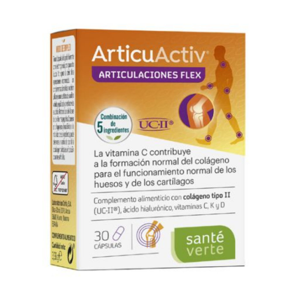 Santé Verte ArticuActiv Articulaciones Flex es un complemento alimenticio formulado para apoyar la salud articular y la movilidad, ayudando a mantener la flexibilidad y el confort de las articulaciones. Está indicado como apoyo nutricional en personas con sobrecarga articular, rigidez ocasional o desgaste asociado a la edad o a la actividad física.